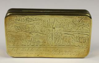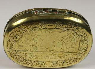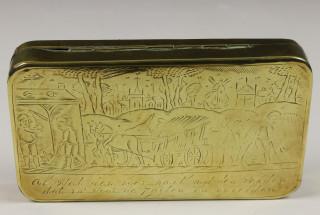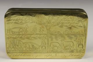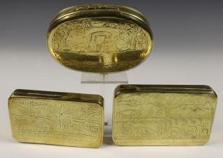 Holland, drie geelkoperen gegraveerde tabaksdozen met scenes en spreuken op het dagelijks leven, 18e eeuw,