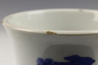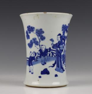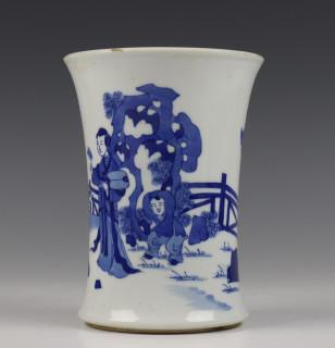 China, blue and white porcelain brush pot, decorated in the 17th-century style with an elegant lady and boys in a continuous garden, with apocryphal six-character mark, 19th/20th century (some frits)