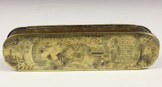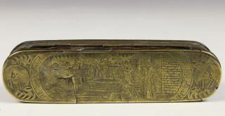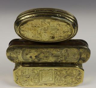 Holland, drie geel koperen gegraveerde tabaksdozen, 18e eeuw,