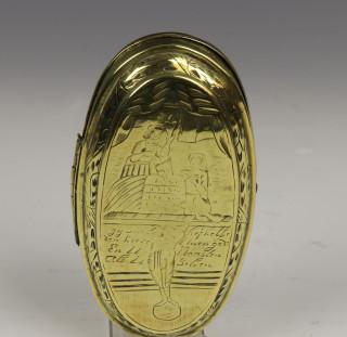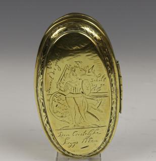 Holland, een geel koperen gegraveerde ovale tabaksdoos 'Den Cristelijke Krijgs Man', 18 eeuw,