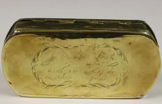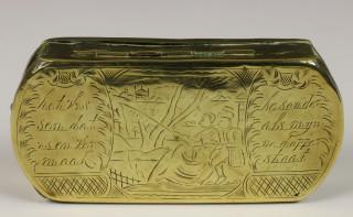 Holland, geel koperen gegraveerde tabaksdoos met scene van vissend echtpaar, 18e eeuw,