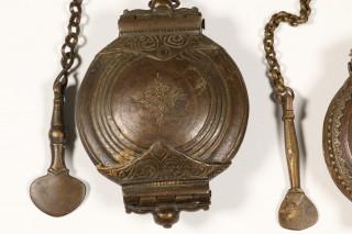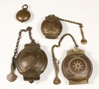 India, four brass and copper chalk containers, two with chain and small knife attached, 19e century