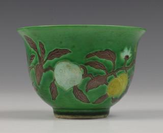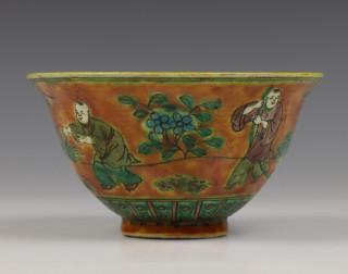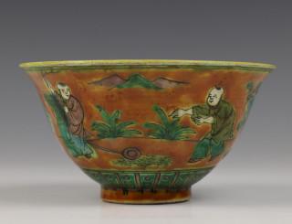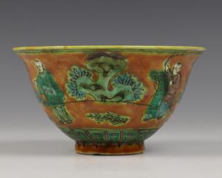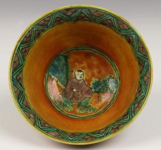 China, two sancai-glazed bowls, one decorated with figures in a landscape, the other with branch of peach, possibly Ming dynasty (some chips)