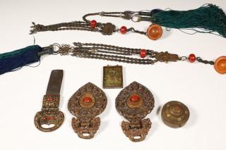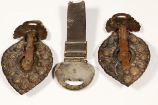 Tibet, twee chuckmuck gespen van gedreven koperlegering met bloedkoraal en een zilver met koperen gesp aan riem,