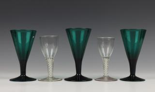 Paar slingerglazen, 18e eeuw en set van drie groen glazen wijnglazen, begin 19e eeuw