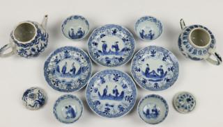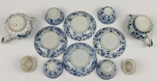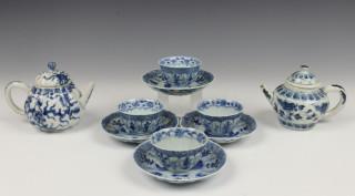 China, twee blauw-wit porseleinen trekpotjes en serie van vier kop en schotels, Kangxi