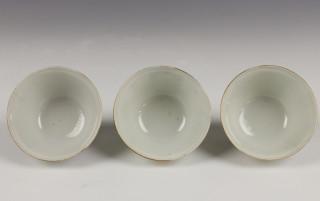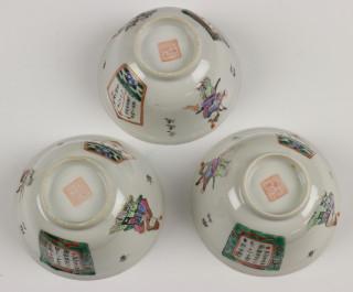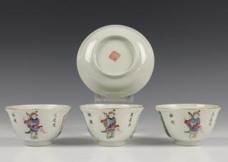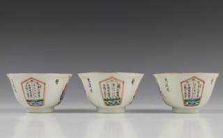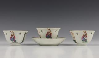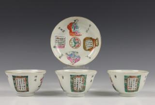 China, drie famille rose koppen en één schotel, Qing dynastie, 19e eeuw,