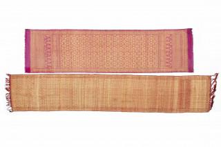 with a supplementary weft gold thread pattern of diamonds and flower heads. On one side a panel with a mirrored pattern of pucung rebung. Herewith East Sumatra, ceremonial shoulder or hip cloth, songket, wiith supplementary gold thread pattern of floral motifs. On both ends trees, triangles and birds