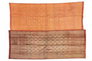 the central field with a floral pattern in supplementary weft of gold thread. Both ends with a panel of mythical animals, flowerheads. One want side bordered by alternating triangles and floral motives and a row of birds. Herewith two Palembang kain songkets, early 20th century.