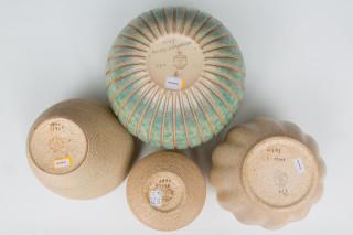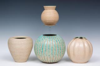 bestaande uit twee horizontaal geribde vazen, een gelobde vaas en een lichtgroen geglazuurde vaas