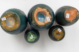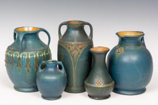 Mobach, vijf aardewerk groengeglazuurde kannen en vazen, ca. 1910,
