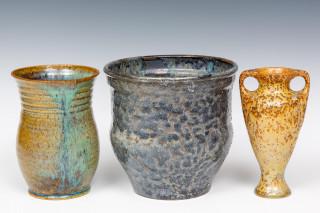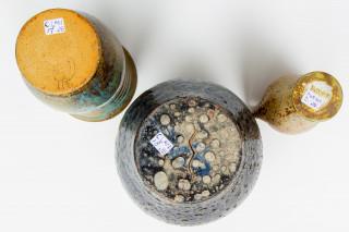 beide met gespikkeld glazuur, daarbij een Dorna vaasje (de grootste met bakfout onderzijde en kleine chip aan onderrand)