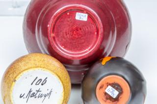 bedekt met een amber, rood en oranje glazuur (de grootste rode vaas met chips aan bovenrand, kleiner rood vaasje met glazuurschilfers aan bovenrand)