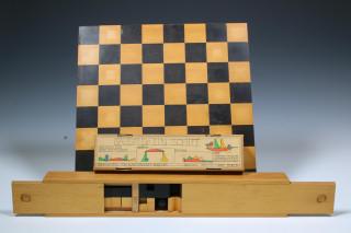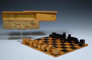 gefabriceerd door de Zwitserse firma Naef, ca. 2000. In houten opbergdoos en compleet met houten schaakbord. Hierbij een bouwdoosje 'Bauspiel'.