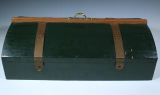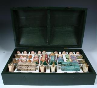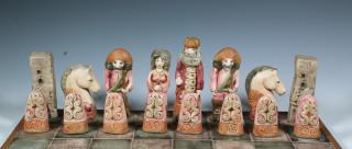 getiteld 'Schaakmat', alle stukken karikaturaal gevormd en polychroom geschilderd, In originele kist. Compleet met keramiek schaakbord. (Hanneke Zuiderhoek, geb. 1940, beeldhouwer/keramist).