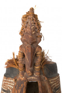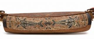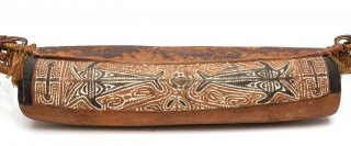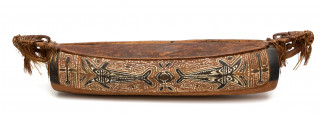 Made of heavy wood with two finely carved handles in the form of ancestral male figures with tassels of plant fibre adorned. The body of the drum with deeply carved decoration of two pairs of fish, masks and geometrical decoration. Painted with black and red pigments and accentuated with chalk. These drums where used in the Men's House to make sacred music and as means of long-distance communication. Private collection Leiden. Possible Provenance Fred Gerrits through information of the family. Objects from Gerrits's collection were sold at Paul Brandt B.V. Auctions Amsterdam , 19 June 1970.
