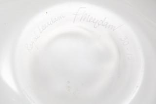 met blauw en grijs lijnenspel. Gesigneerd Royal Leerdam F. Meydam 30-15. Tentoongesteld Sterrentuin Leiderdorp 2011