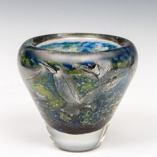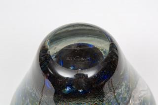vrij geblazen blank glas met ingesloten decoratie van groen en blauw. Gesigneerd Leerdam Unica AD Copier AB 213. Tentoongesteld Sterrentuin te Leiderdorp, 2012. (schilfertjes onderzijde)