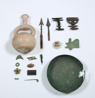 Collection of various antique objects; one pre-Columbian vessel, a decorated bead, an eroded bowl, an Egyptian faience eye