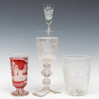 Vier stuks antiek gegraveerd glaswerk