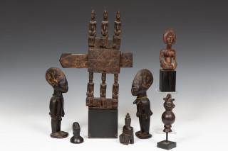 Africa, a collection of six wooden objects and a metal stamp; a door lock with three seated figures on top, two twin figures and a small jakka figure