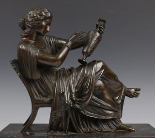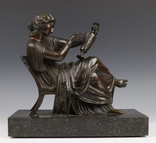 Klassiek zittend vrouwfiguur met geplooid gewaad, een klassieke amfoor beschilderend (aanhechting hand en amfoor los)