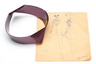 paars geanodiseerd. De kraag kan bevestigd worden d.m.v. klittenband aan een jurk. Voor referentie zie in boek Broken Lines, pag 39, 86. Hierbij een ontwerptekening van Gijs Bakker, van een model met jurk waaraan vast de kraag