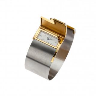 bestaande uit een brede witgouden gesatineerde spangband, met geelgouden eindstukken met geometrisch L-vormig ontwerp, aan één zijde is deze L-vorm een scharnierend deksel waaronder een rechthoekig horloge met een verzilverde wijzerplaat met streep-index en de signatuur Loewe. Aangedreven door een mechanisch handopwind uurwerk, merk Ebel. Vervaardigd door UTI, Frankrijk (armband) en Zwitserland (uurwerkkast) omstreeks 1980.