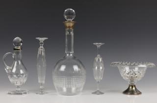 hierbij een kleine kristallen karaf met hengsel en vierkante voet, een coupe op een zilveren voet en vier diverse portglazen.