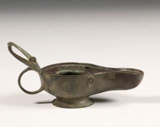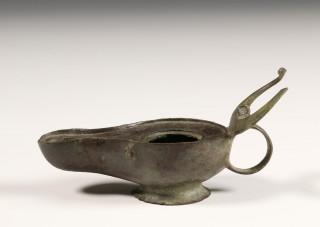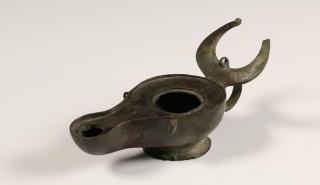 Roman bronze oil lamp, Lunula, with handle and half-moon decoration, 1st-3rd century.