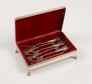 doos met houten interieur, lepeldoosje met greep en rood fluwelen binnenkant, hierbij zes zuurvorkjes, alle 2e gehalte