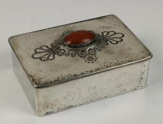 langwerpig model houten interieur met gehamerde en versierd buitenzijde met amber cabochon, essayeur Christian F. Heise Copenhagen 1920, scharnierend fijn bewerkt doosje met meandermotief in rand, vergulde binnenzijde, met meesterteken(onduidelijk), 1e gehalte, beschadigd,