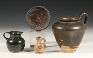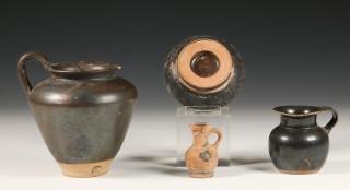 Attic black ware dish and miniature jar, 5th-4th century BC and Campanin two jars, 4th century BC.