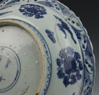 China, blue and white porcelain dish, Ming dynasty, decorated with a deer and crane in fenced garden, with four character mark (broken, crack)