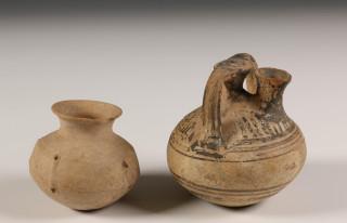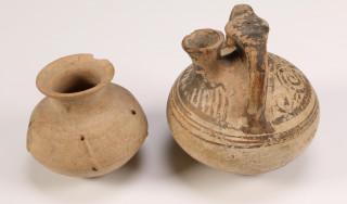 Cypriotic terracotta stirrup jar with handle and sprout, 11th century BC and terracotta pot with five hanging holes, possibly 11th century BC.