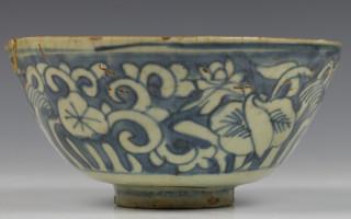 China, blue and white porcelain bowl, Ming dynasty, decorated with cranes and lotus (repaired chip, damages)