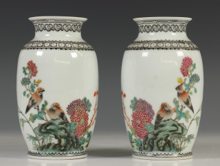 China, pair of small famille rose vases, 20th century, decorated with birds in a flower garden, with apocryphal Qianlong mark (one with rim chip), provenance: Collection Cserno, Amsterdam
