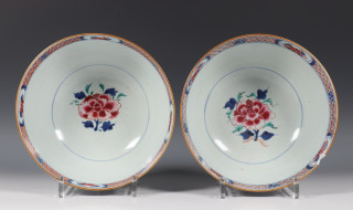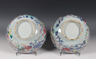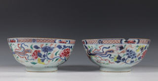 China, pair of famille rose bowls, Qianlong, decorated with phoenixes among peony (one with chip and hairline)