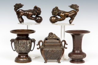 China and Japan, collection of bronze objects, 19th century, comprising two buddhist lions, a censer and two vases, provenance: Collection Cserno, Amsterdam