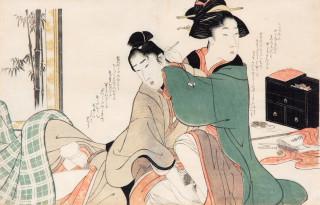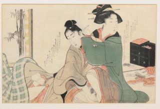 Shunga, geisha reinigt het oor van haar bezoeker. Oban, in lijst