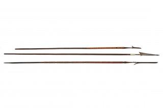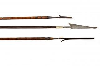 with worked iron blades, two with plantfiber bindings and one with four carved faces in the upper wooden shaft. Private Dutch collection.