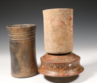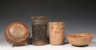 two decorated bowls and a cylindrical vase, one black cylindrical vase with engraved decoration, all with defects