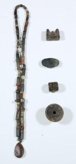 Colombia, Tairona, 1000-1500 AD, a polished stone necklace, miniature stone shamen's stool, lip ornament, stone cilindrical amulet with deep carving and a terracotta spindle.