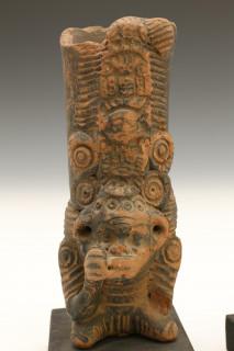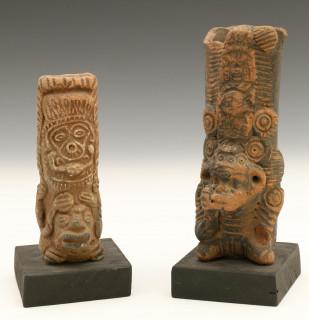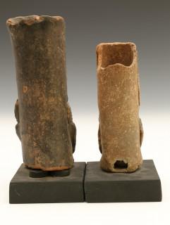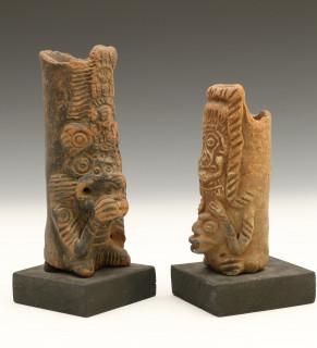 Guatemala, two terracotta urns, pipe shaped, decorations of anthrophomorph animal and rider, possible 400-800,