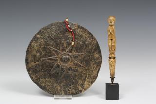 Timor, metal disc shaped breast ornament and a bone handle, possibly Moluccas.