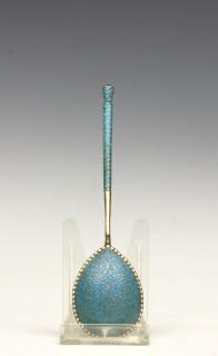 de steel en buitenzijde van de bak zijn turquoise geëmailleerd. Gekeurd 84 Zolotniki, Stadskeur voor Sint Petersburg, 'A.A. 1896' en meesterteken 'MTM'. De lepel komt uit het bezit van de bankiersfamilie Baron von Berenberg-Gossler te Hamburg.