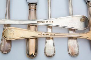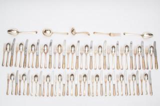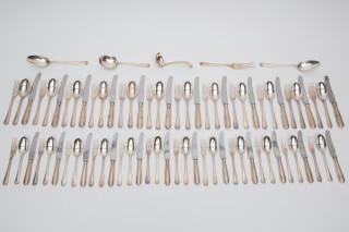 bestaande uit twaalf tafel- en dessertcouverts, twaalf tafel- en dessertmessen, vier opdienlepels en een vork, mt. Wed H. Helweg Amsterdam 1915, 1917, 1923, 1925 ,1930, 1e gehalte, messen diverse meestertekens en jaarletters, dessertmessen, 2e gehalte