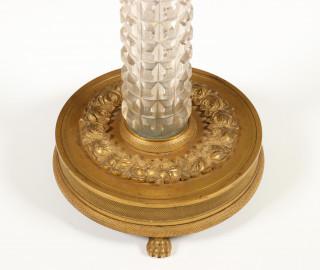 met bronzen vuurvergulde ornamenten en kantig geslepen kristallen stam. Geheel op cilindrische voet staande op drie klauwpootjes.