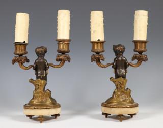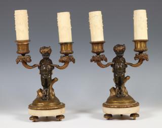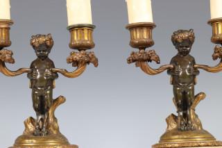 A pair of bronze two light candelabra with figures of satyrs, Louis XV style, 19th century.