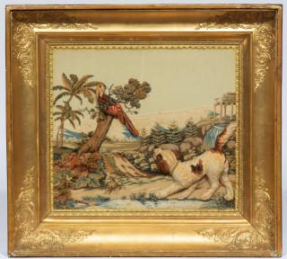 voorstellende een geborduurde stoffen hond en papegaai in een klassiek landschap. Geheel in diepe verguld houten lijst met glasplaat.
